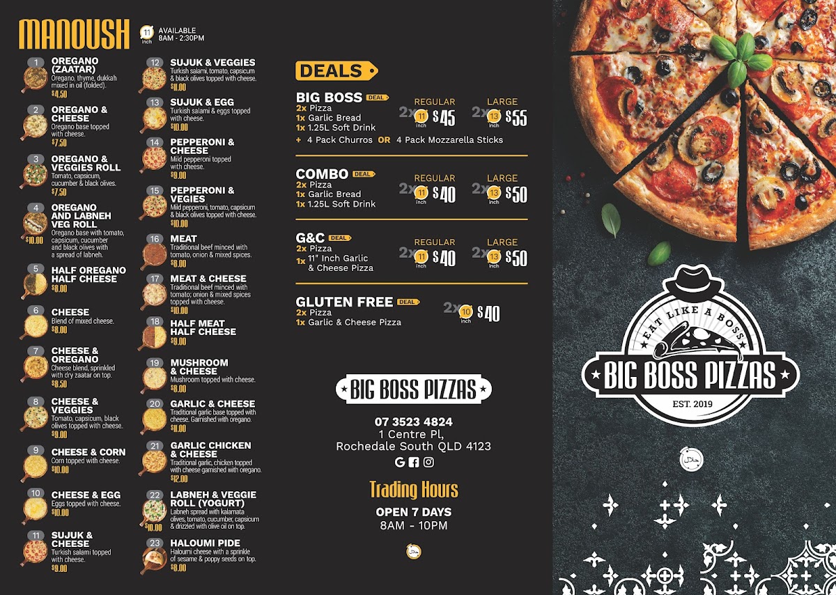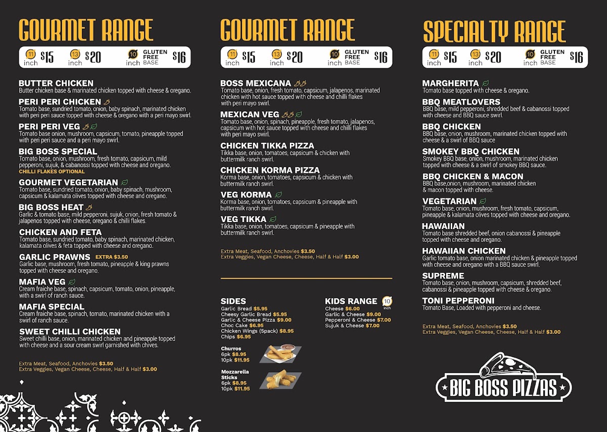 Introducing the menu of Big Boss Pizzas, a gem located in Rochedale South, QLD, offering an unforgettable culinary experience that resonates with pizza lovers. Their standout dish, the peri peri chicken pizza, has garnered rave reviews, with customers praising its top-tier quality and bursting flavors.